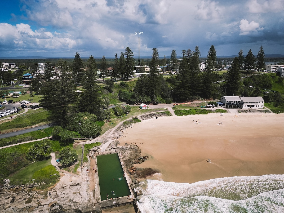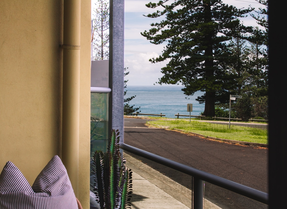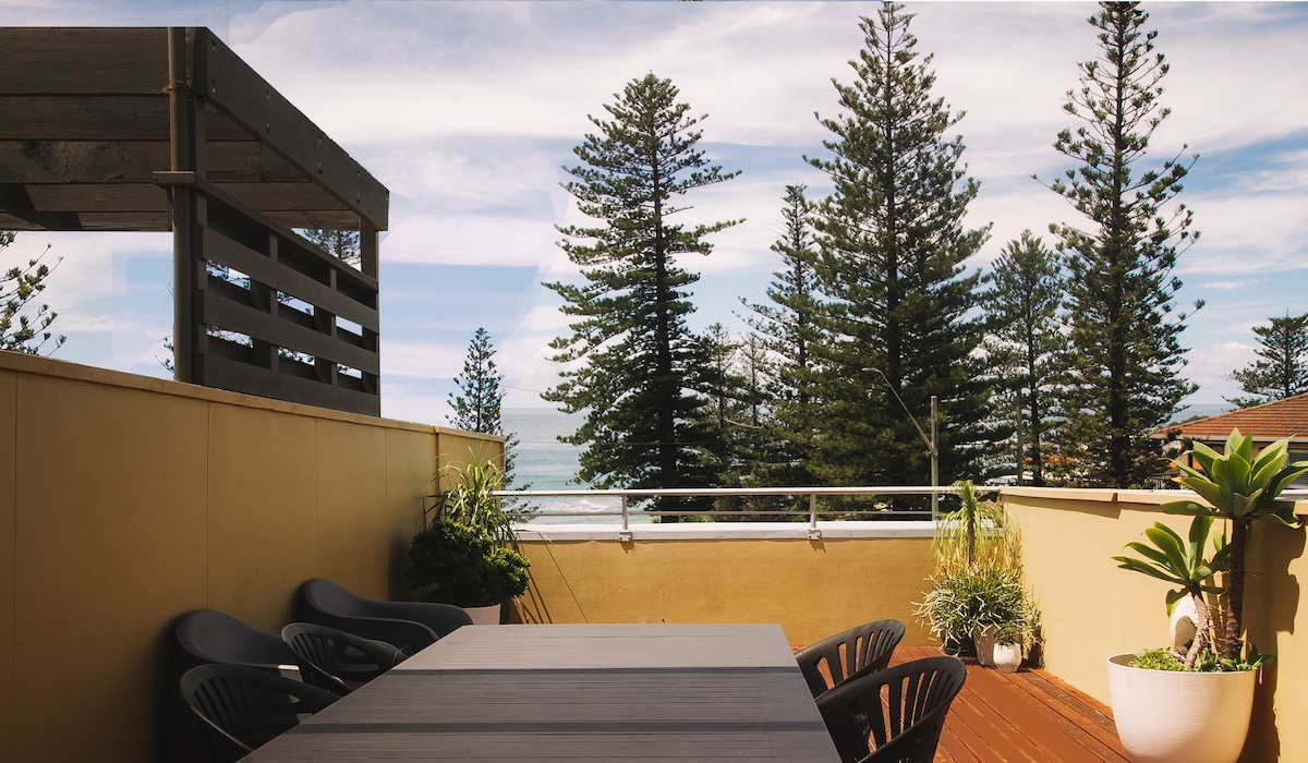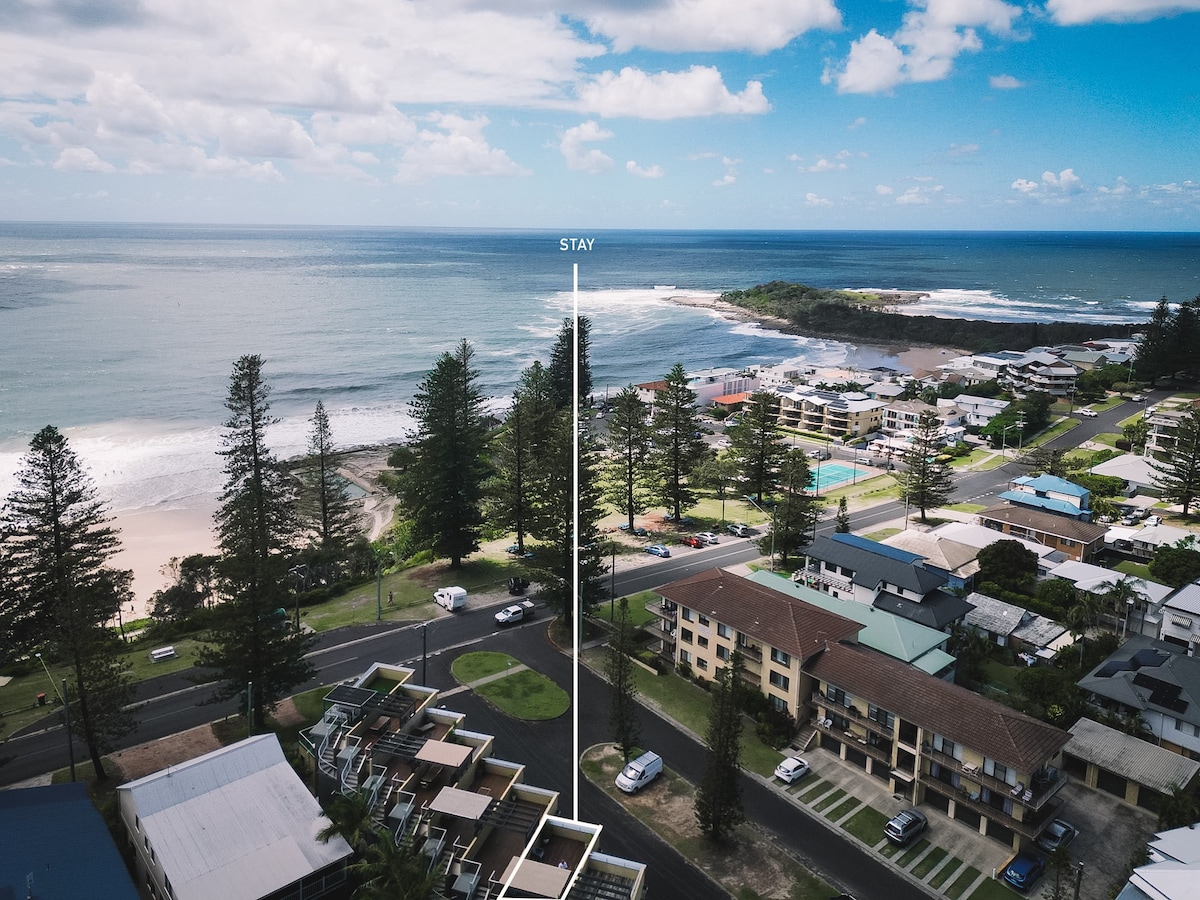 Discover the perfect family getaway in our beachside apartment with a rooftop terrace and lovely sea vistas. Embrace the coastal charm, relax in comfort, and make lasting memories by the waves. Welcome to your home away from home. Elegantly vertical, this tri-level apartment showcases a slender profile, maximising space efficiency and ocean views - which are visible from the master bed & lounge balconies as well as rooftop terrace.